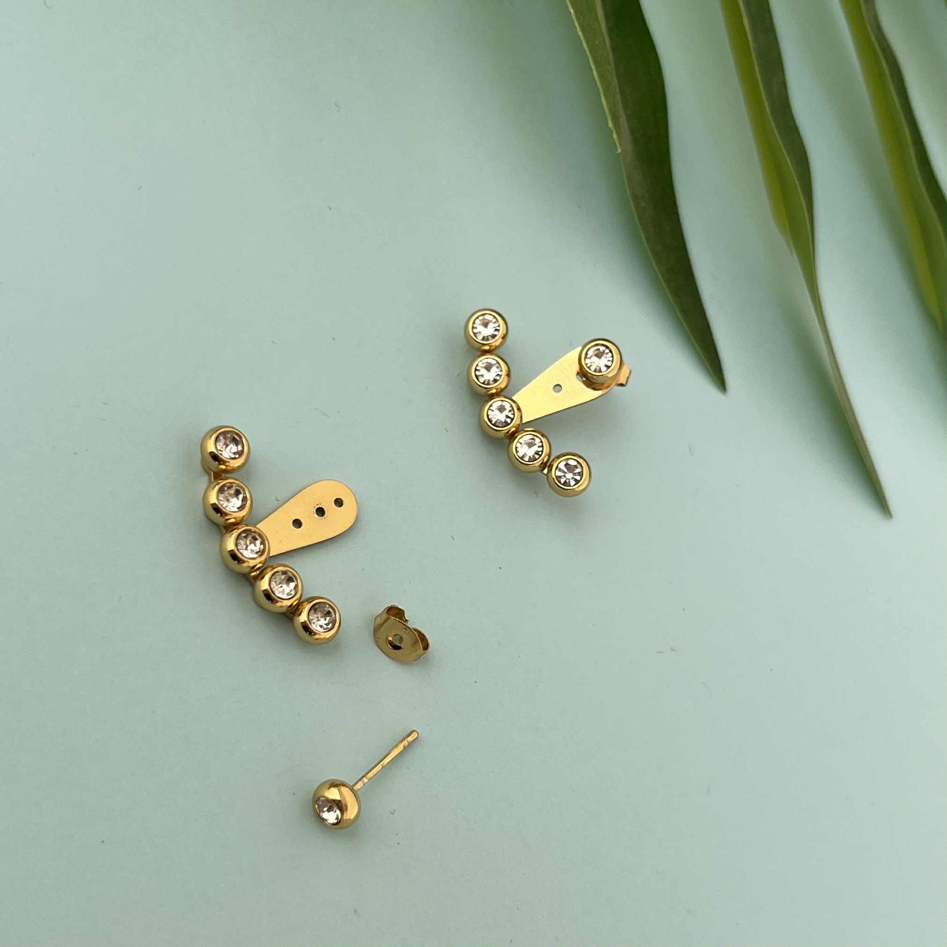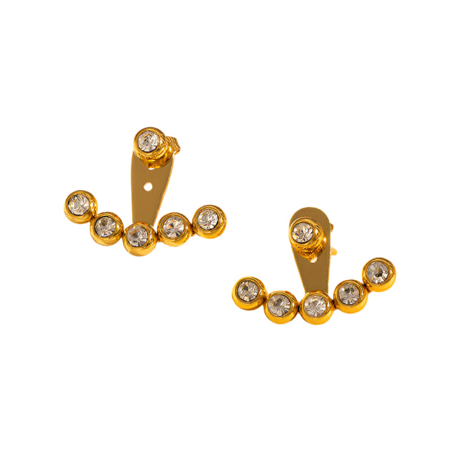 These exquisite earrings feature a two-piece design combining gold and white crystals. Their elegant and refined style makes them perfect for formal occasions, while their versatility allows for a chic casual look as well.