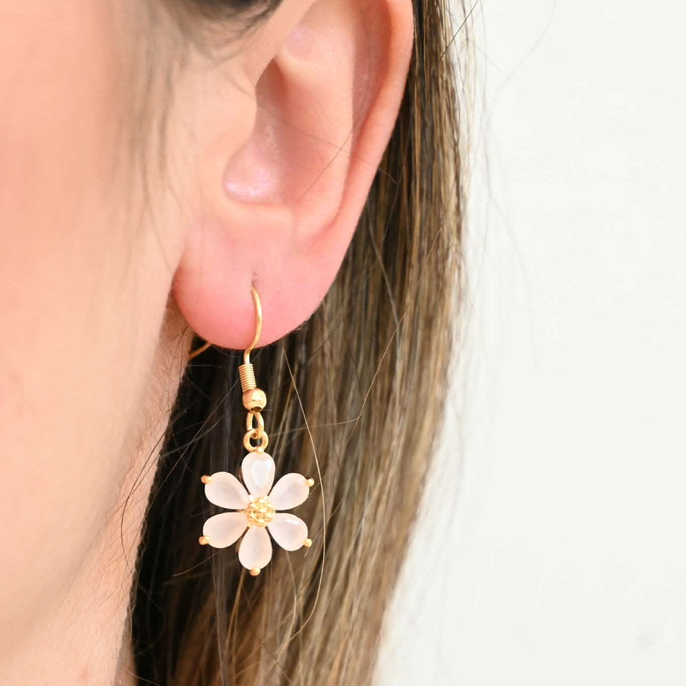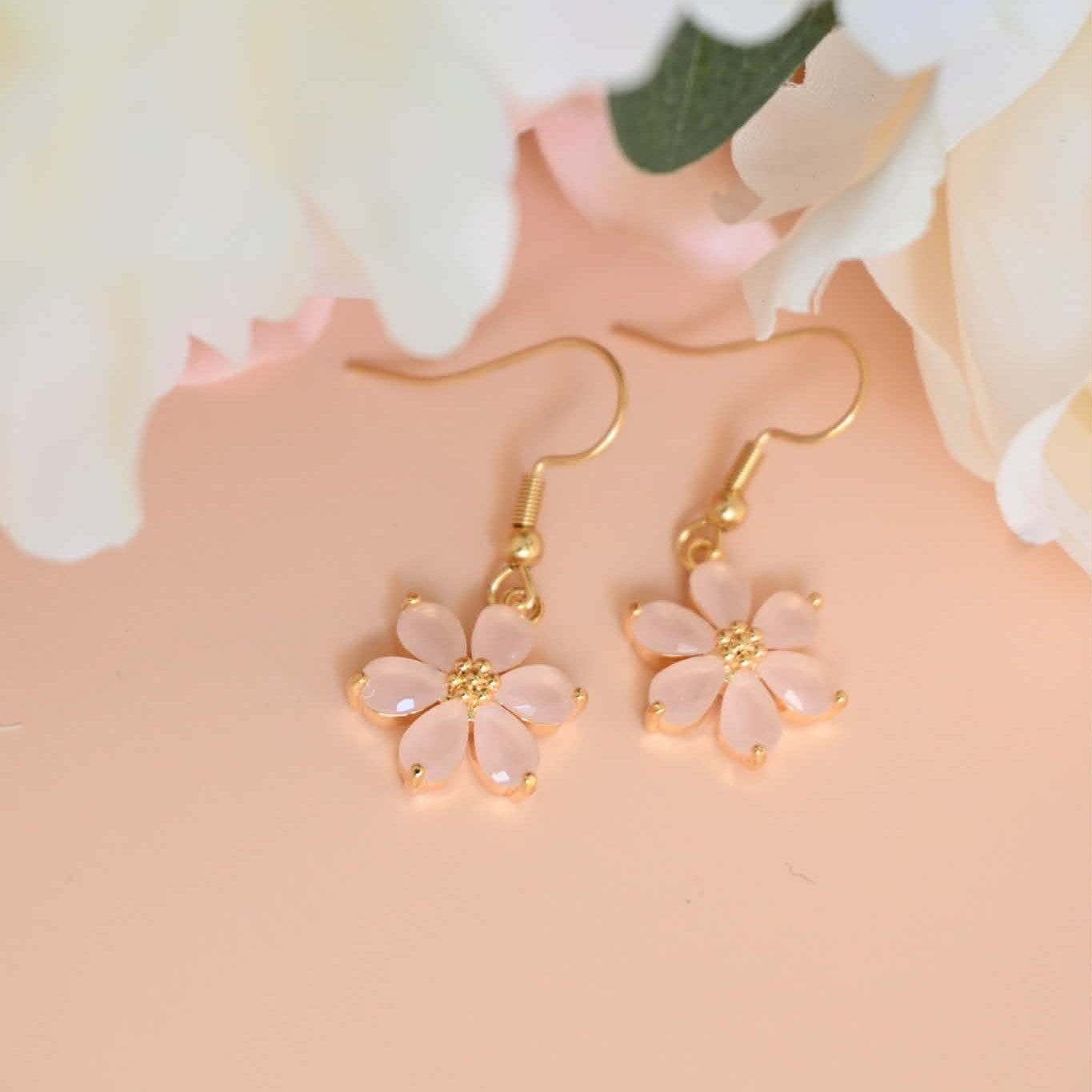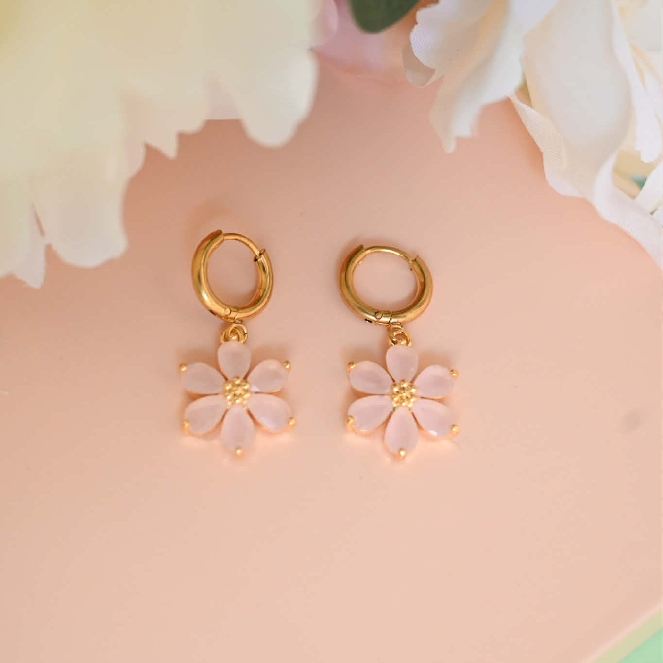 - Huggie Earrings: a modern, close-fitting hoop with a subtle floral drop