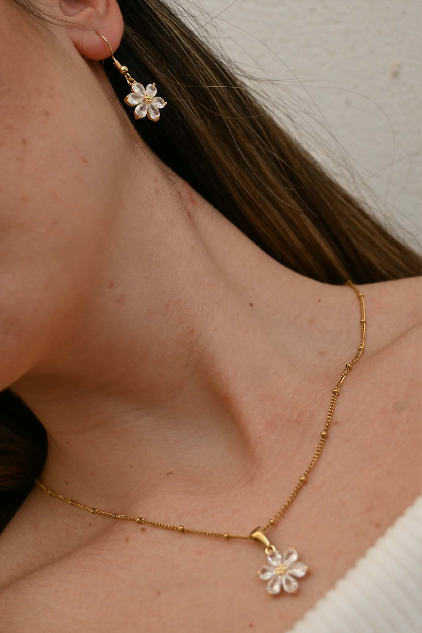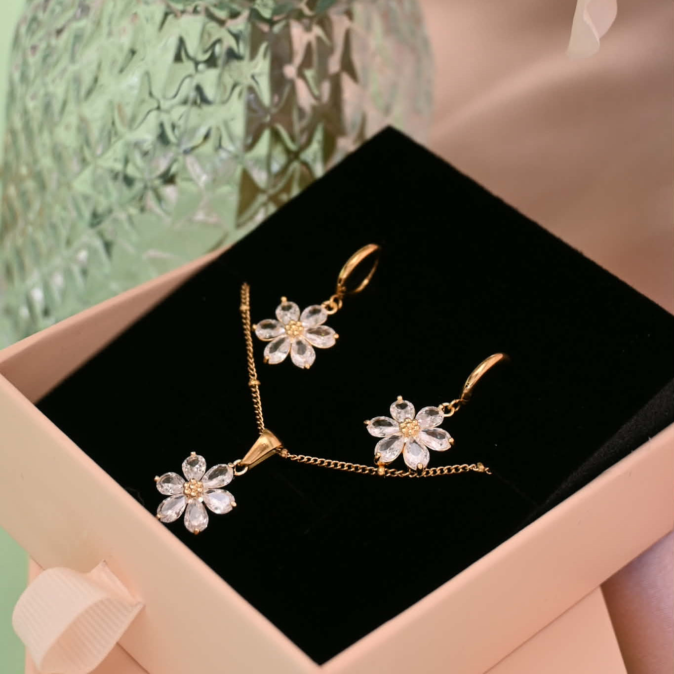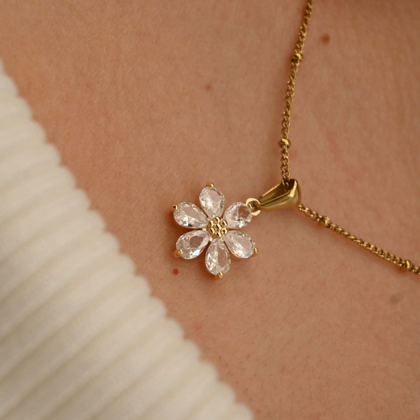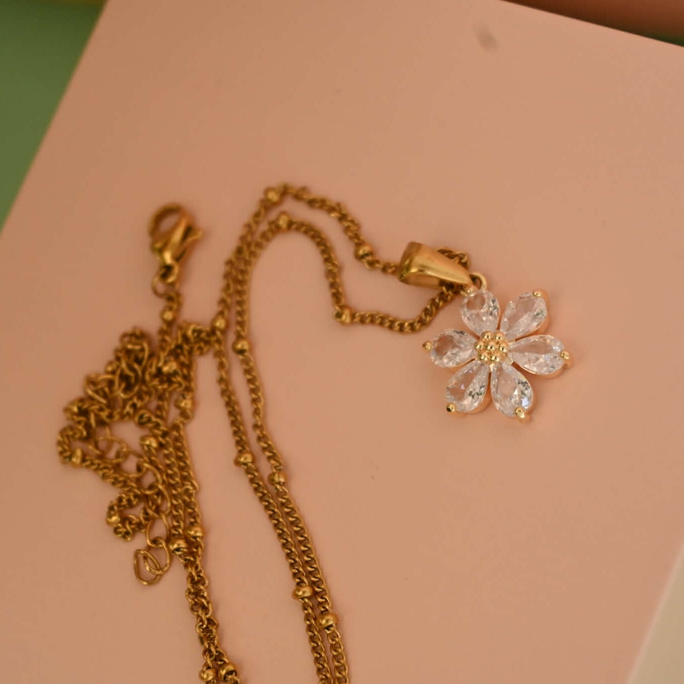 - Pendant Necklace: a delicate floral accent resting elegantly at the neckline