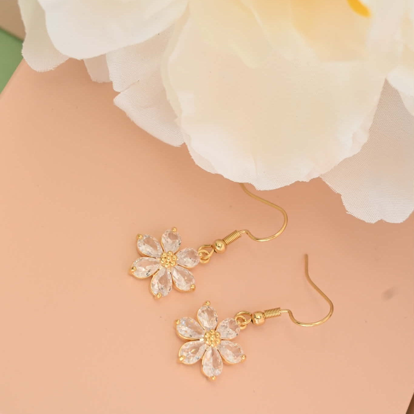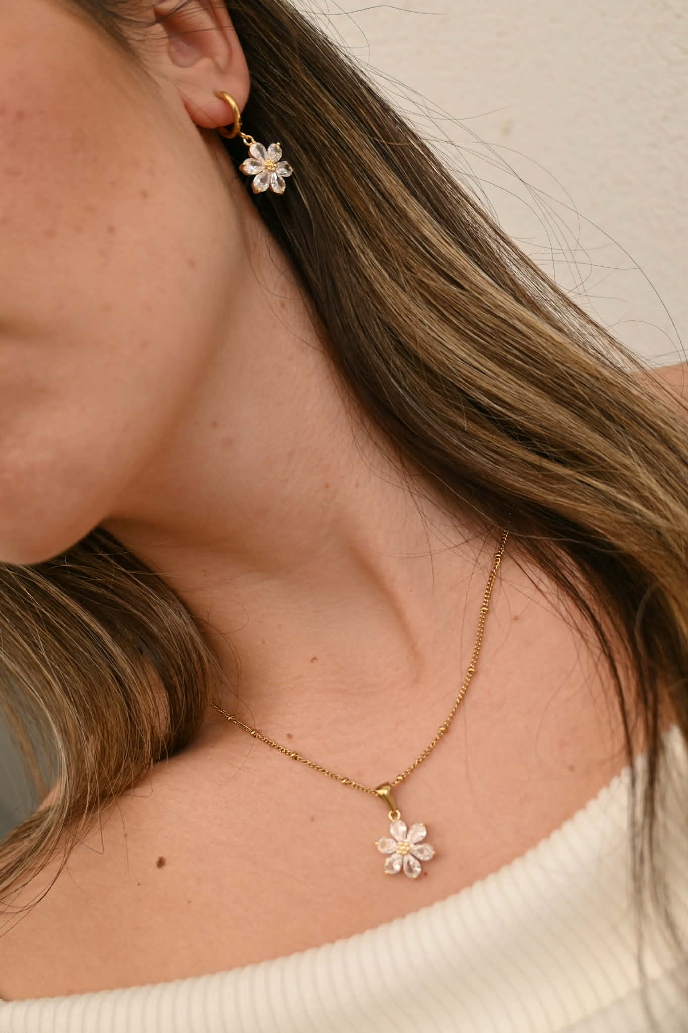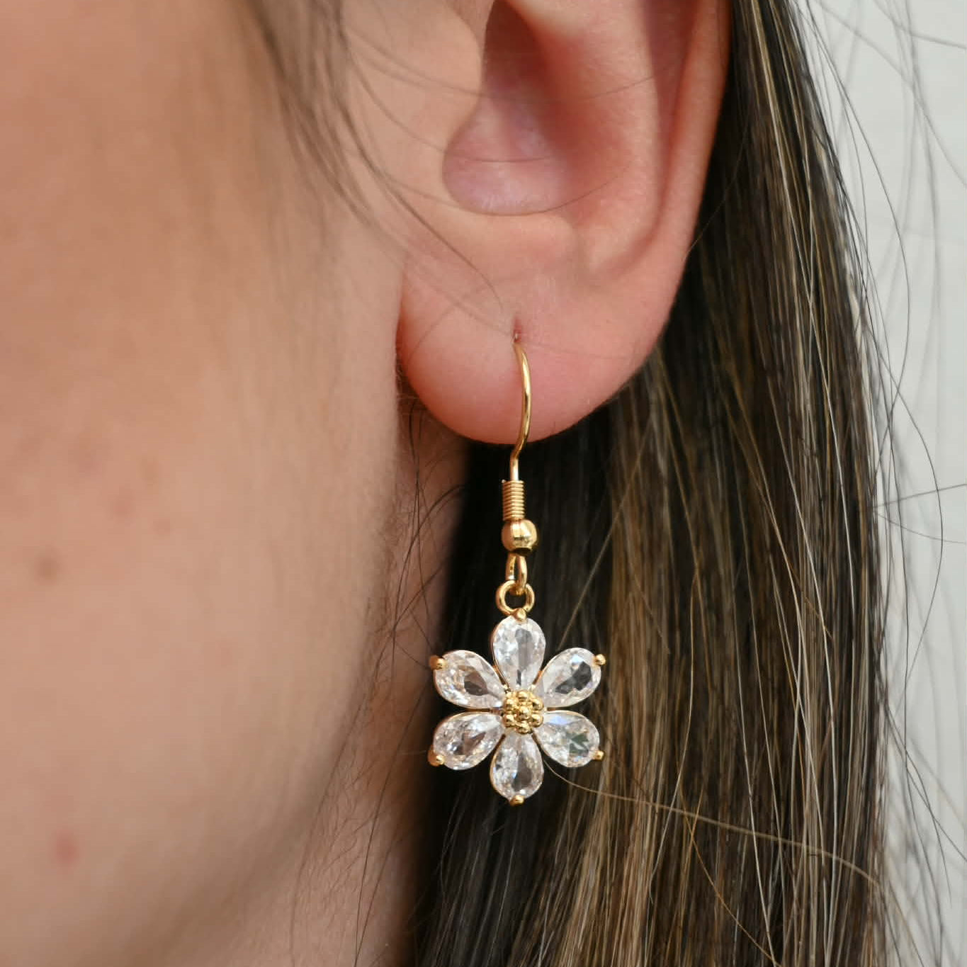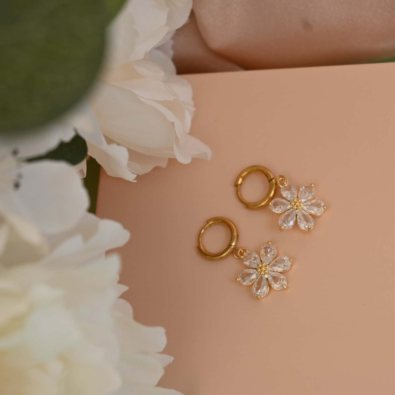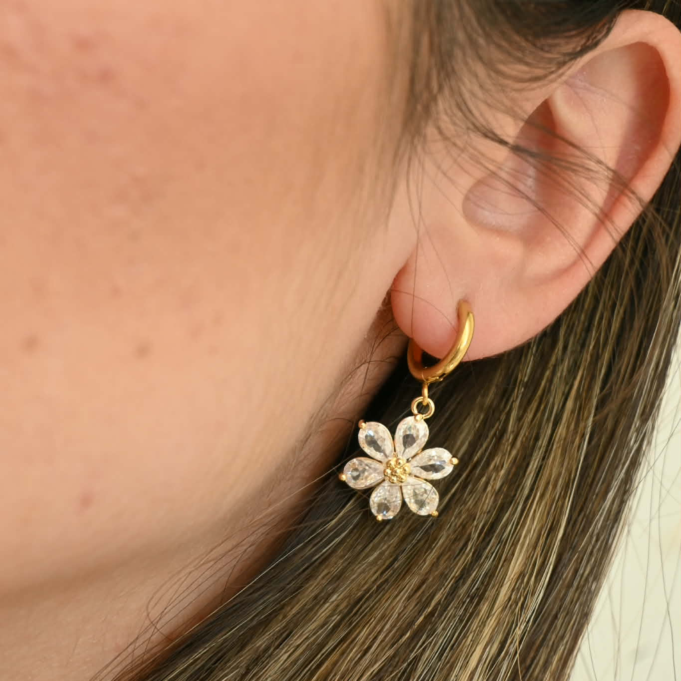 - Huggie Earrings: a modern, close-fitting hoop with a subtle floral drop